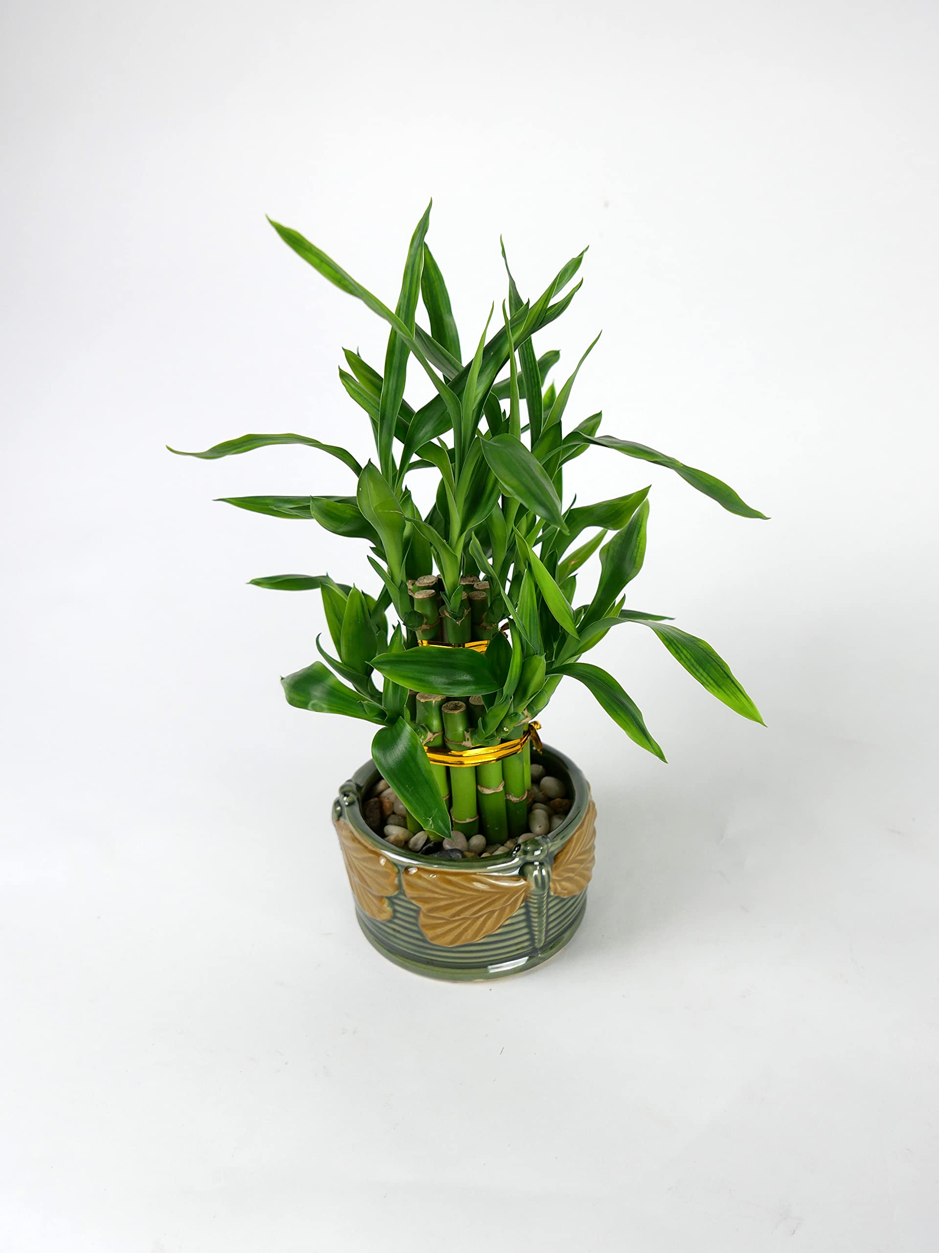 Our 2-Tier Lucky Bamboo Tower features fresh live bamboo stalks (4" and 6") arranged in a compact double-layer design. Each arrangement includes a handmade ceramic pot adorned with a lucky frog motif — a traditional symbol of prosperity and good luck — plus a bag of natural mixed-color polished stones for easy setup. A type of Dracaena, lucky bamboo thrives indoors with minimal care, making it a long-lasting, low-maintenance addition to any home or office.