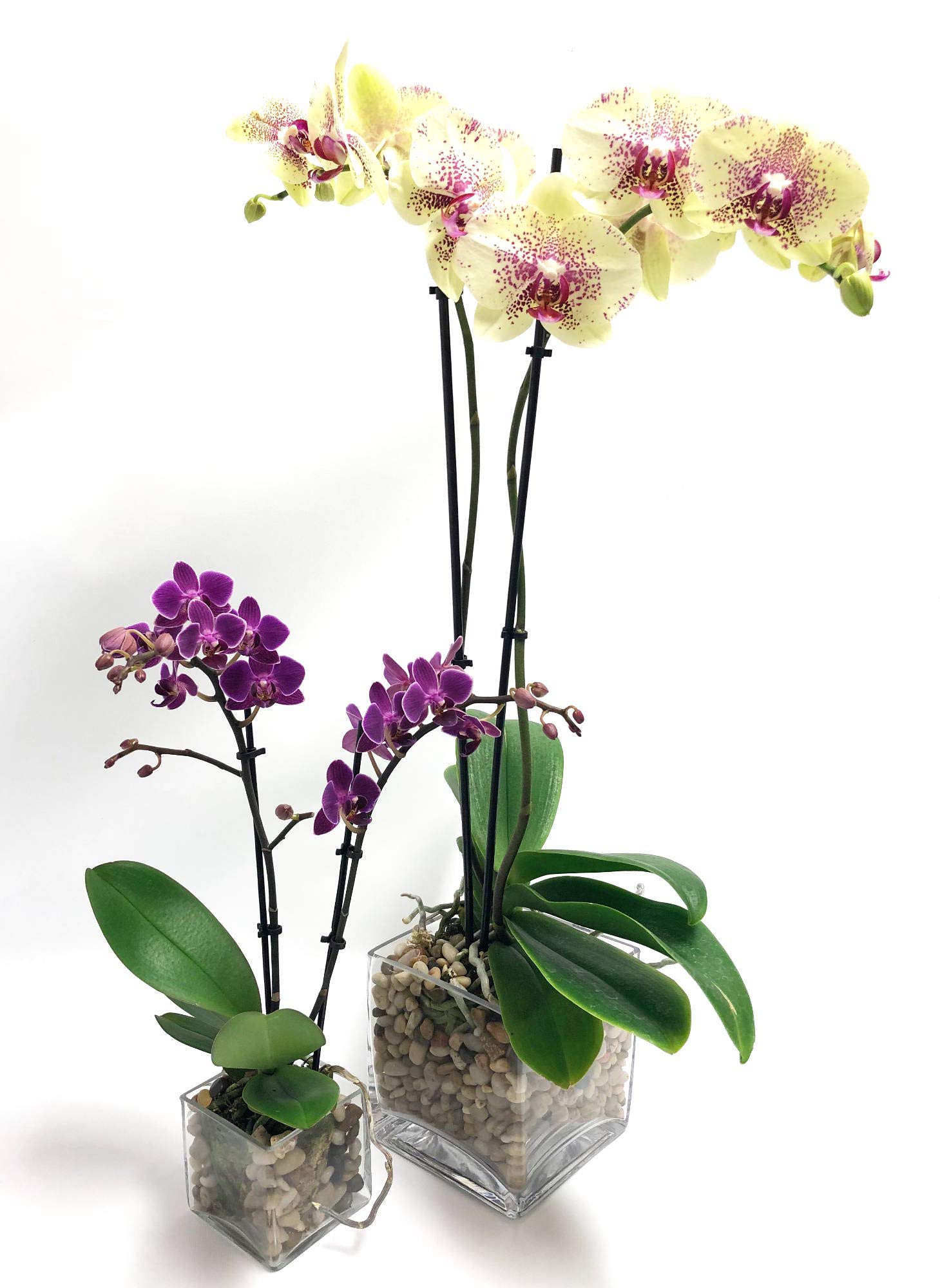- Two live Phalaenopsis orchids – yellow (5”) and purple (3”) blooms